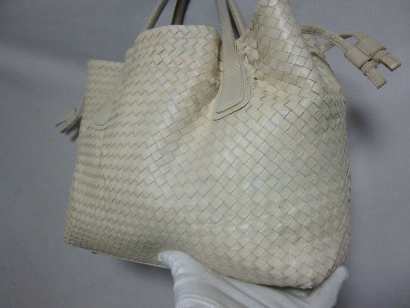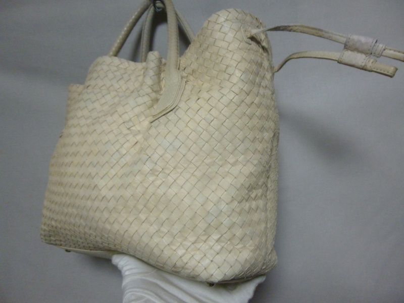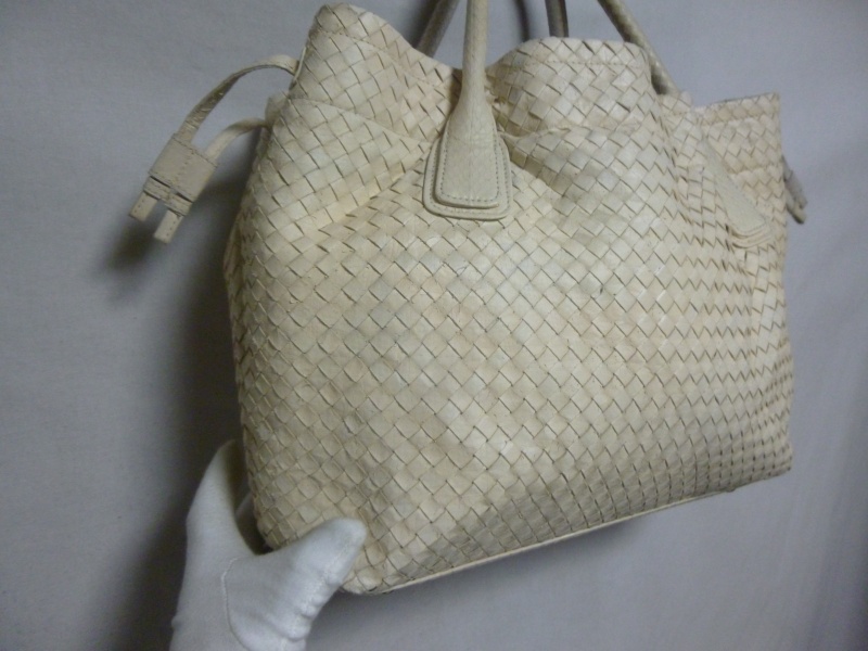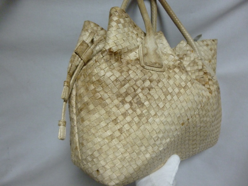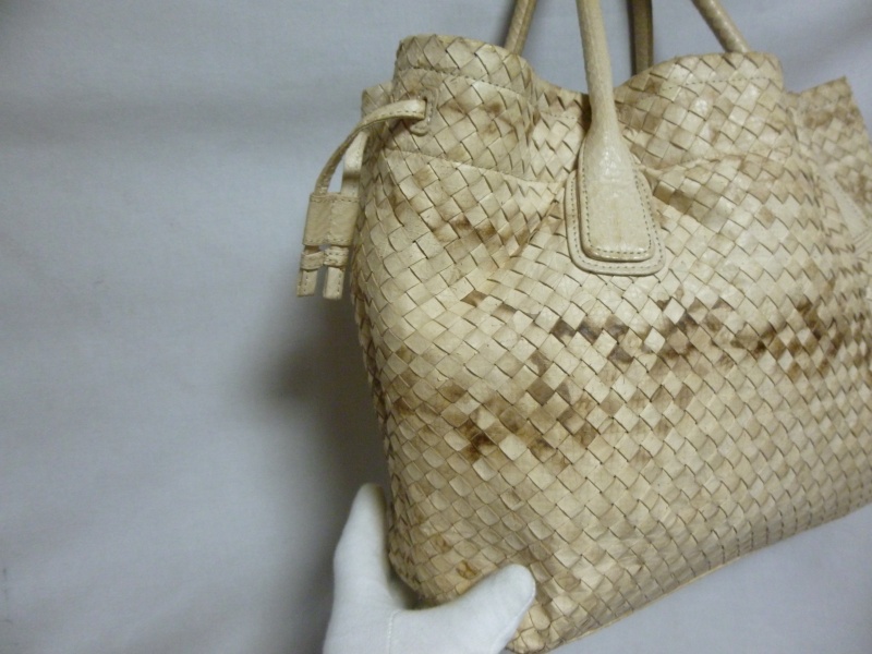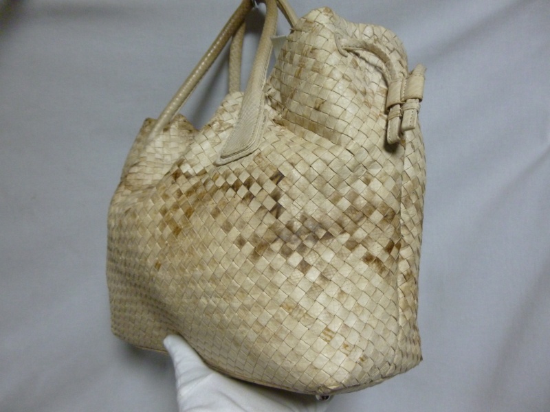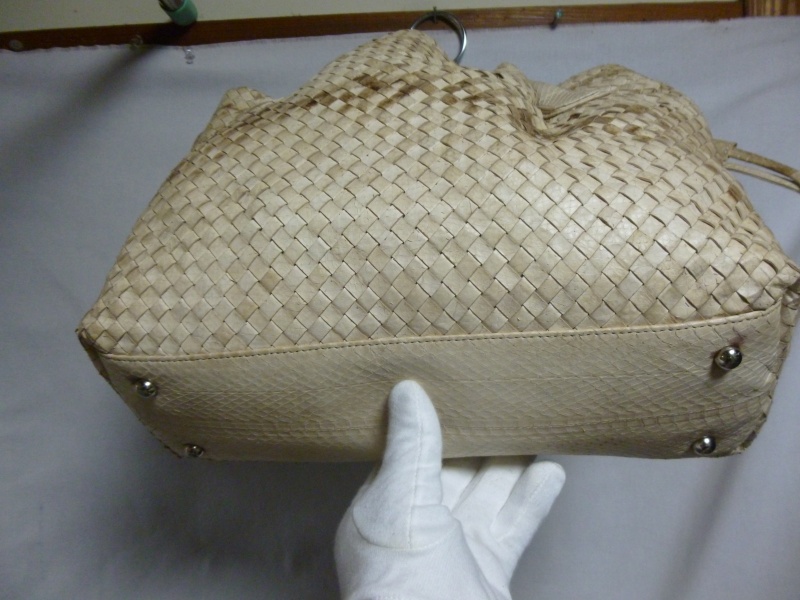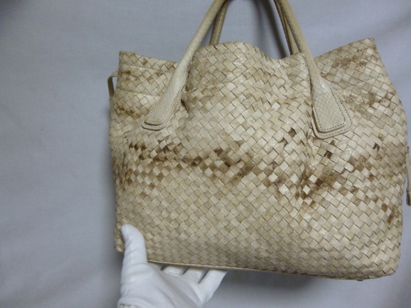 雨に濡れて、元々のパイソンの柄の色が出てきているような症状でした。ホワイト系の黒染みは若干残る場合もございますが、今回は大分手こずりましたが、どうにか復元いたしました。