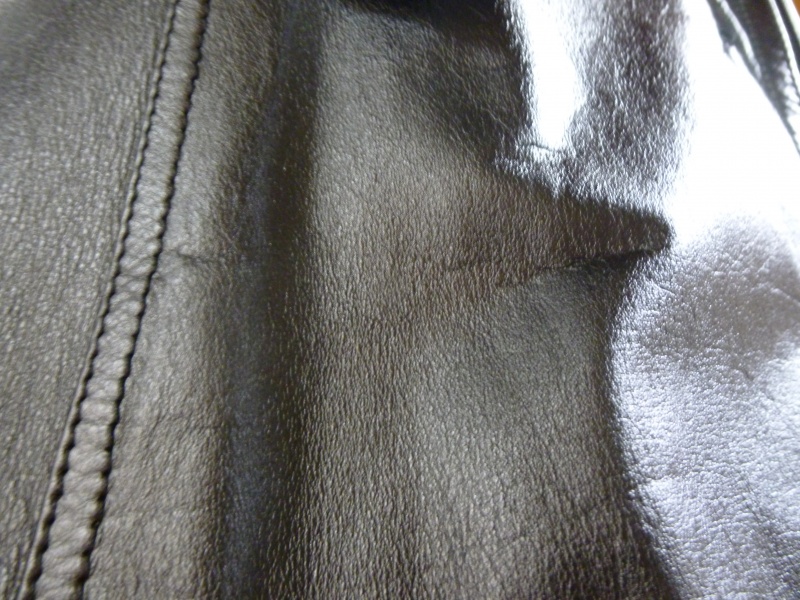 左肩の破れ部位は、裏地からあて革をし、表面の凹凸部は樹脂で埋めて、研磨→埋めて→研磨・・・を繰り返し平らに仕上げております。