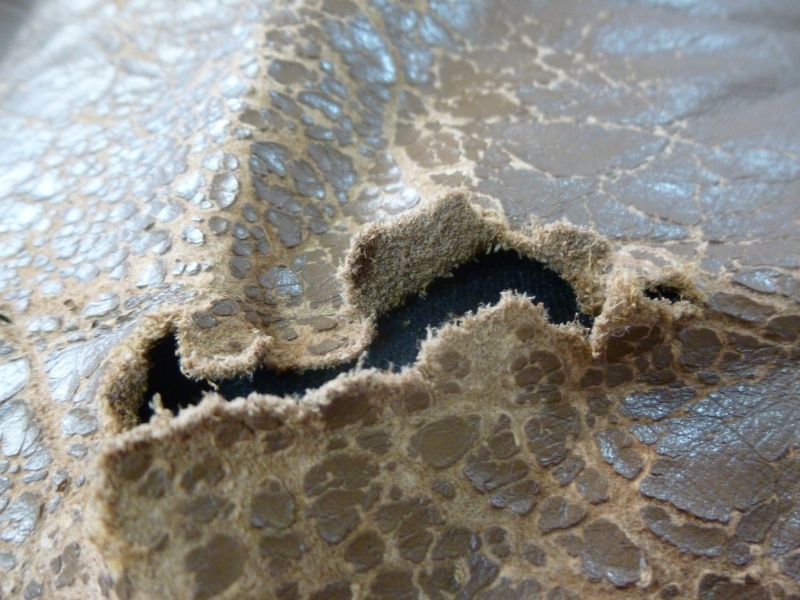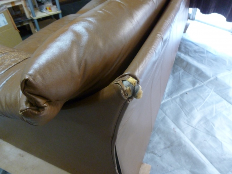 向かって右肘の破れ部分に関しては、通常、肘部分だけの張替をご提案しておりますが、ご予算の関係上今回は、一度解体し裏側から革を1枚あてて施工しております。表面の段差は、表面形成材を塗布→研磨 を繰り返して平らにして参ります。台座部分(最後の写真)の破れに関しても同様な内容ですね。