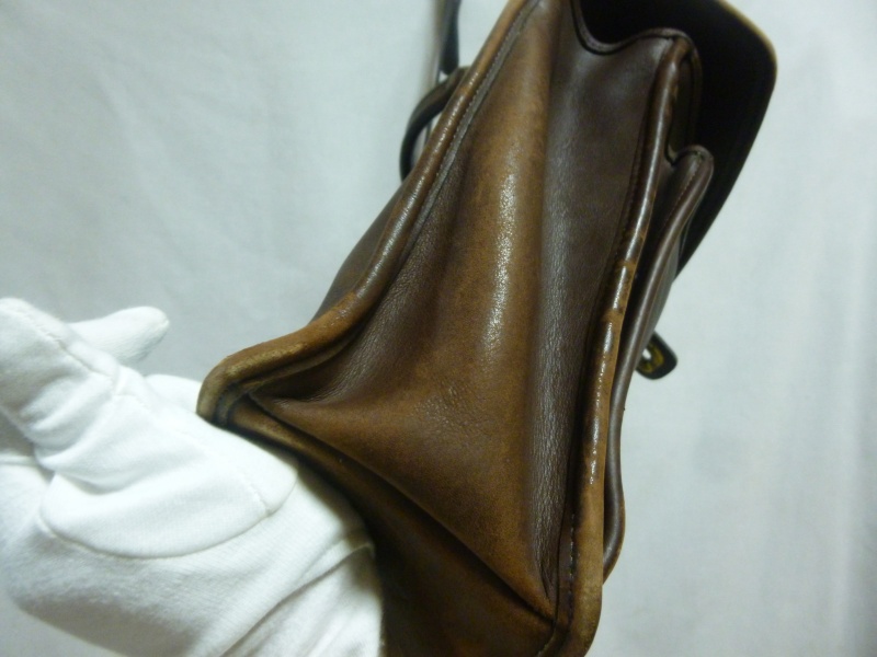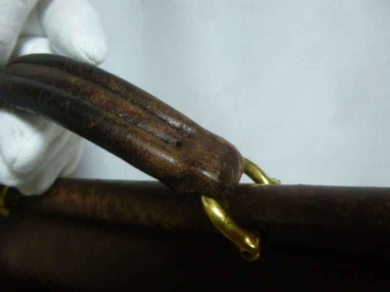 写真ではちょっとわかりにくいですね。この持ち手は、2本あるように見えますが、1本の持ち手で作られています。長さでいうと2mほどになりました。このすべての持ち手を合皮から革素材へ交換しています。耐久性もアップしています。合皮は特性上、経年劣化でボロボロ剥がれてきます。これは致し方ありません。また、よく質問を受けますが、高いブランドバックだからと言ってすべて本革で作られている訳でもありません。特に財布やバックの内側部分などは合皮の場合が多いです。