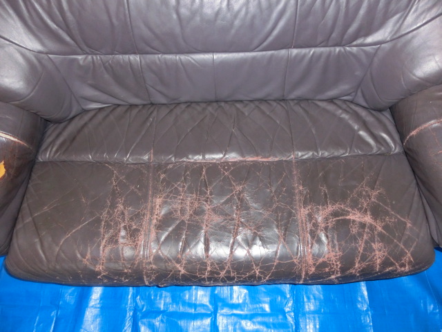 今回のソファは座面と肘掛けのキズ、ヒビが進行し数か所破れていました。
