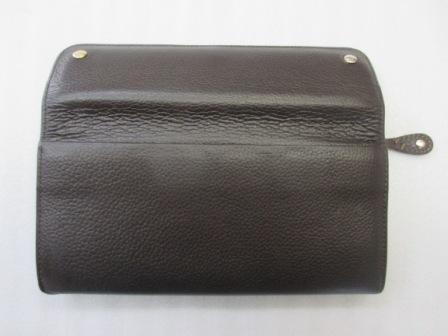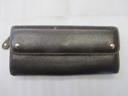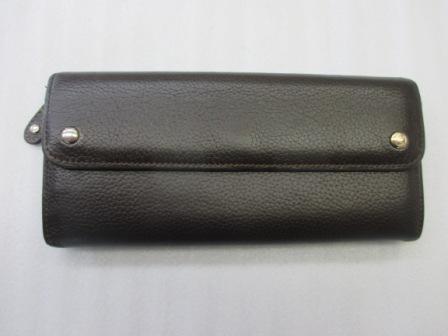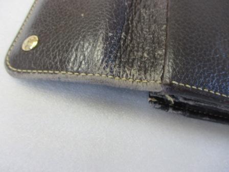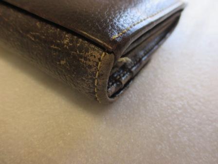 濃いめのブラウンの本革製お財布・・・本体のスレキズやコバ(革の外側の断面)のキズが目立ってきている、ということでリペアを承りました。