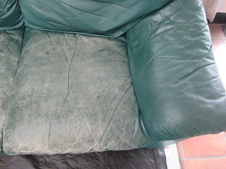 先日ご紹介したグリーンの本革ソファーの3人用の方です。こちらも座面のスレキズが多く、座面のキズを中心にその他のキズ補修、そして全体を染め直しました。