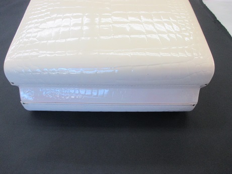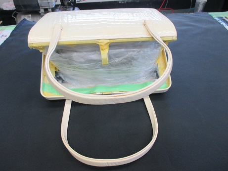 クロコ柄型押しの白いバンドバッグ・・・ほとんど使わず長い間しまっておいたが色を変えれば使う機会も増えるのではないか、ということでカラーチェンジの施工を承りました。